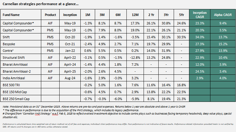 2025 was a strong year for Carnelian, where differentiated strategy and bottom-up stock selection drove meaningful outperformance in select portfolios.